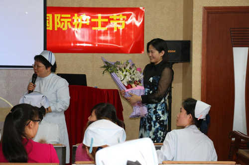 护士们被蔡蕴敏女士的先进事迹感动为其送上鲜花