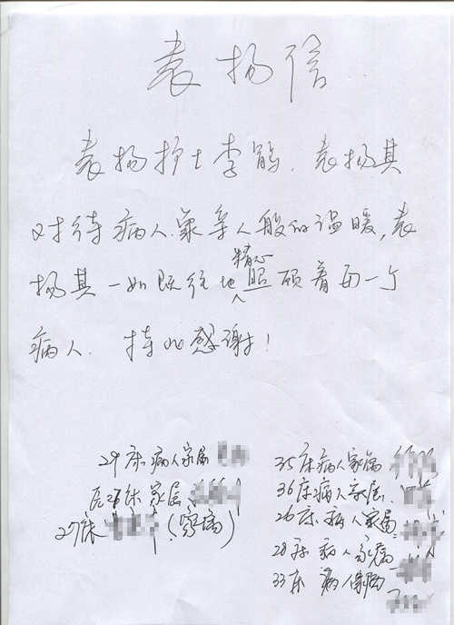 患者家属写信表扬医院护士