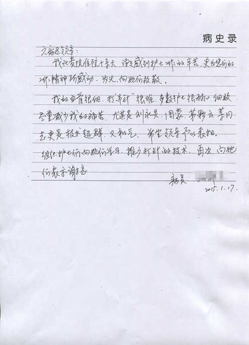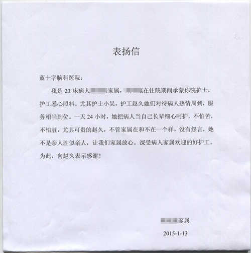 患者家属写信表扬医院护士和护工