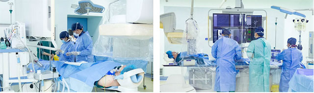 上午10点开始,许奕教授带领一组人员深入DSA介入手术室作手术指导。两例椎动脉(AV)扩张支架置入术及一例颅内动脉瘤栓塞术,手术由上海蓝十字脑科医院脑血管病病区主任张琪博士主刀,许奕教授在操作室给予技术支持。