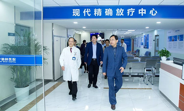 参观放疗科时,蒋志云副主任饶有兴致地听取了王晓东主任关于放疗设备的介绍。