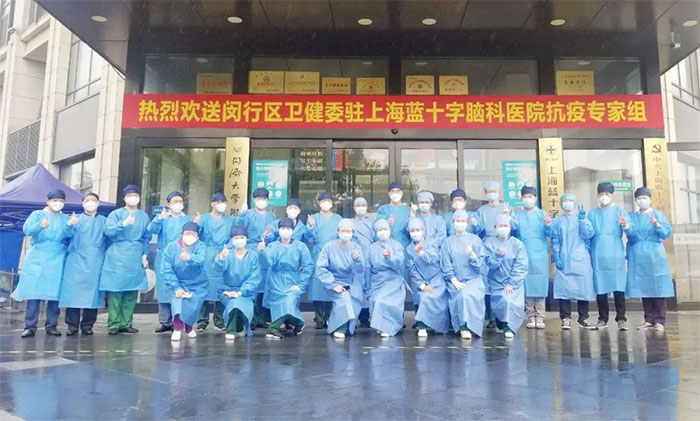 4月24日,在闵行区卫健委的干预下,市五医院医务科科长施劲东为组长,区卫健委人口与发展科科长吴军、医政科蒋东真,区疾控中心王伟杰、范佳磊、孙汉卿,市五医院科护士长翁玲琍、护士长黄春萍、医防科宋伟洁、党办主任翁晓雯为组员的抗疫专家组火线进驻上海蓝十字脑科医院。
