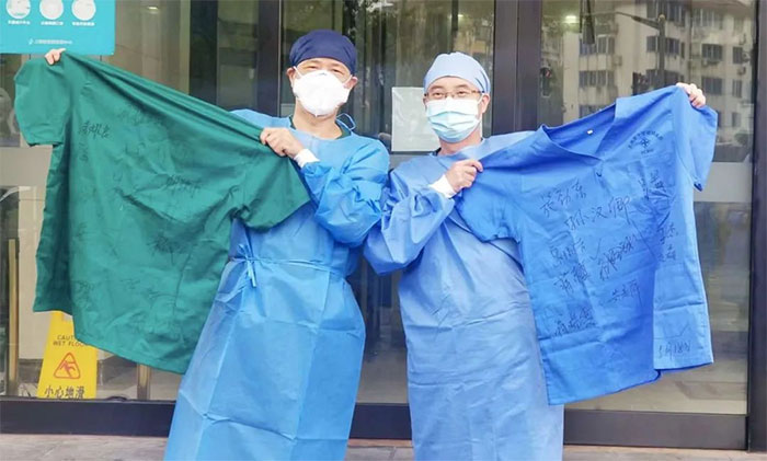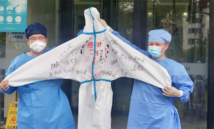 “感谢一路有你”,总经理兼书记朱敏,更是将这一“特殊时期”的“特殊事件”镌录在了一件防护服上,并赠予专家组,以表达全院职工的无限感激和崇高敬意。