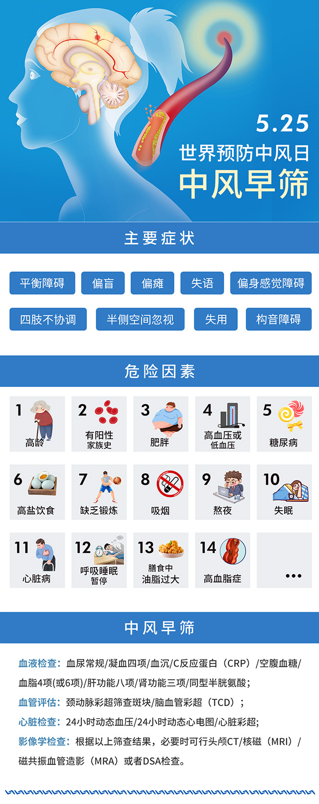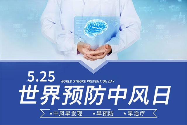 今年5月25日是第15个“世界预防中风日”。“脑卒中”(Cerebral Stroke) 又称“中风”、“脑血管意外”(Cerebral Vascular Accident,CVA),是由于脑血管突然发生破裂出血或因血管堵塞造成大脑缺血、缺氧而引起。脑卒中具有高发病率、高复发率、高致残率、高死亡率的“四高”特点,是我国居民健康的“第一杀手”,给患者、家庭及全社会带来沉重负担。