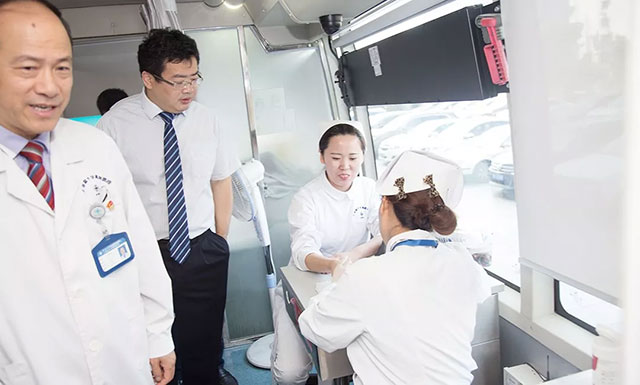▲ 朱敏书记(左二)与项耀钧院长(左一)登上采血车看望无偿献血员工