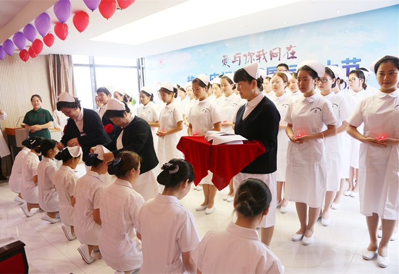 随后,护理部赵建华主任宣布仪式开始。48名新毕业护士身着洁白的护士服,手捧红烛,伴随着轻快的音乐,迈着轻盈的步子列队依次走上台,单膝跪在护理前辈的面前,由主任护师赵建华主任、副主任护师杨丽萍护士长为新护士带上圣洁的燕帽。