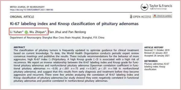 此后又以共一作者身份在影响因子为1.29的《英国神经外科杂志》发表题为“Ki-67 labeling index and Knosp classification of pituitary adenomas”(中文:垂体腺瘤Ki-67标记指数和Knosp分类)的论文。