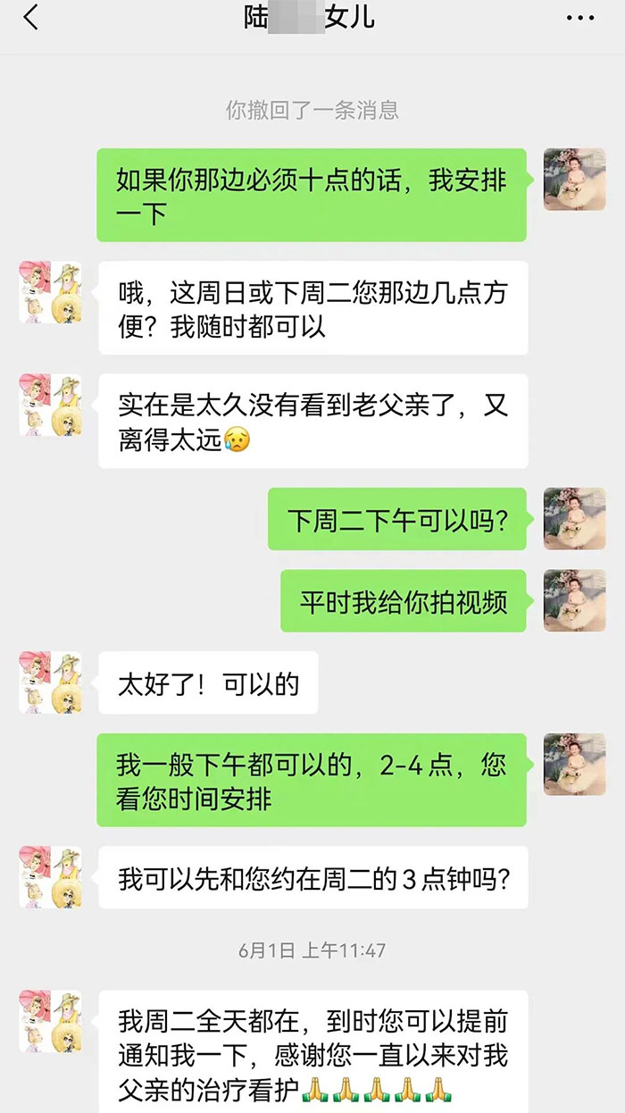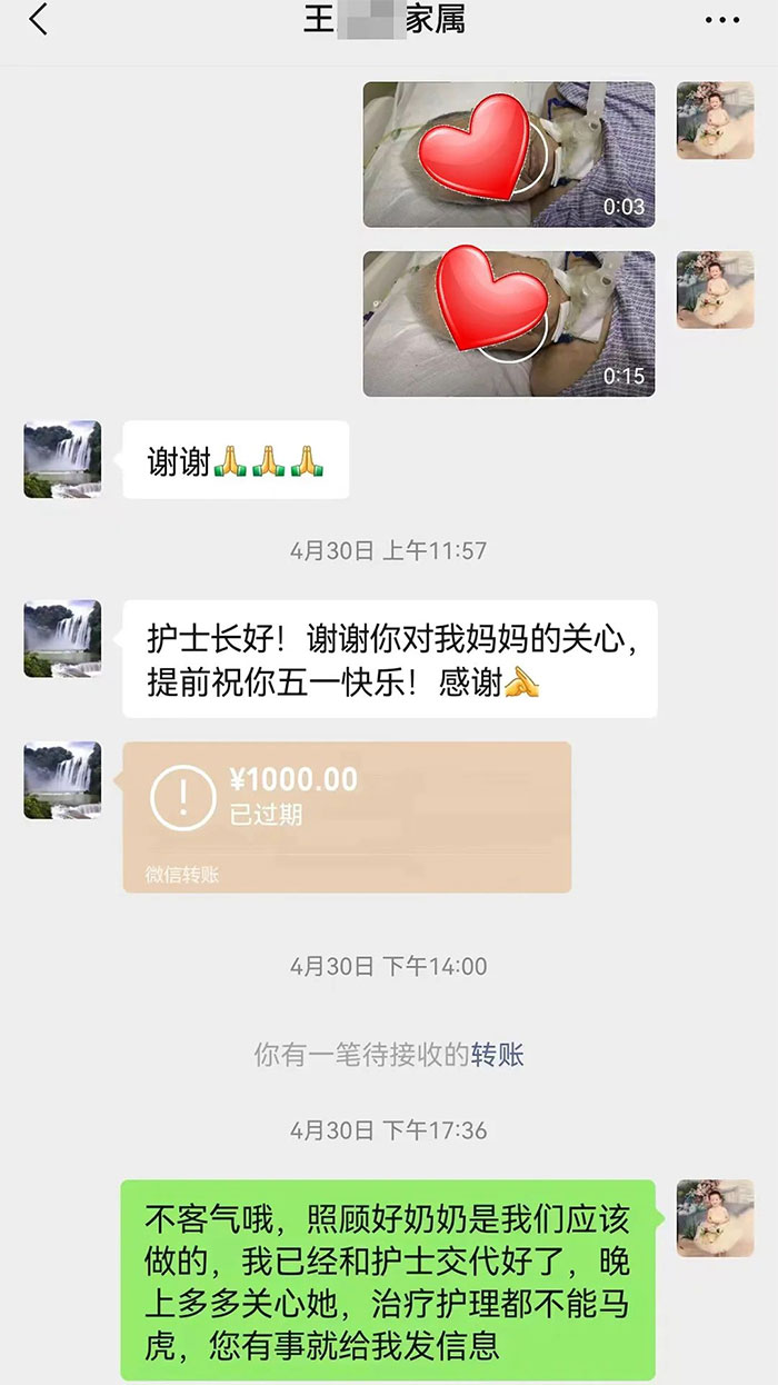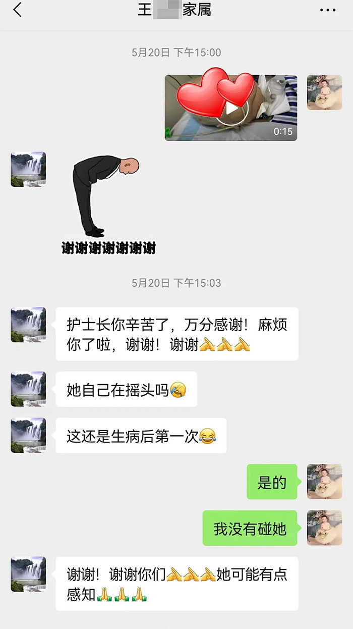 疫情防控之下,医院谢绝家属探视。8A团队推己及人,用拍照和录视频的方式将患者的病程进展尽可能具象地呈现给家属。患者陆某为脑出血患者,遗留肢体障碍,长期卧床,并发严重肺部感染,经过团队悉心救治病情平稳。家中四个女儿,尤其是小女儿远在国外,十分牵挂病重的父亲。为此,团队专门为她们建了一个微信聊天群,每天在群里发送老人的情况。小女儿只有每周二有空,胡燕华便定好闹钟,定时与其小女儿视频,让她每周都能通过视频见见父亲。还有更多的患者,也是通过8A团队这样的用心良苦以解相思之苦、牵挂之心焦。“辛苦了,万分感谢!”“太人性化了,很感动!”家属纷纷表达感谢!