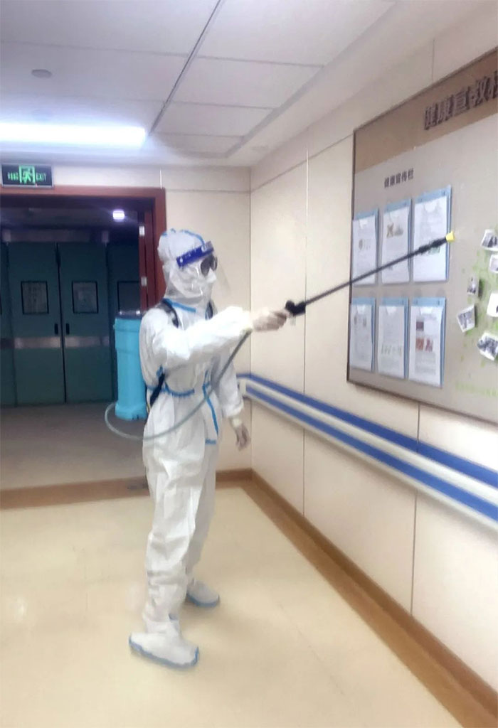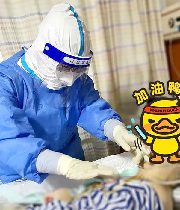 在她的带领下,王海澄、王杰、吕浩浩、李连冬、李洁、于宝淳等护士克服各种困难,夜以继日坚守岗位。长长的病区走廊,白衣天使来回穿梭。只有短暂的休息间隙,那发皱蜕皮的双手和酸疼麻木的双脚才能让她们意识到防护服之笨重,劳动强度之巨大。