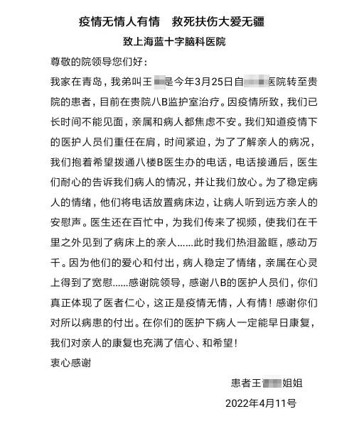 在信中家属表示,因疫情影响,远在青岛的家属与患者长时间不能见面,十分焦虑不安。抱着试试看的想法,家属拨打了病区电话。了解情况后,医护人员不仅安慰家属放宽心,还将电话接到患者病床边,让王先生能听到远方亲人的声声安慰。此后,重任在肩的医护人员还时常百忙中抽空与家属视频,能直观了解患者的治疗和恢复情况。这让家属热泪盈眶,感动万千。