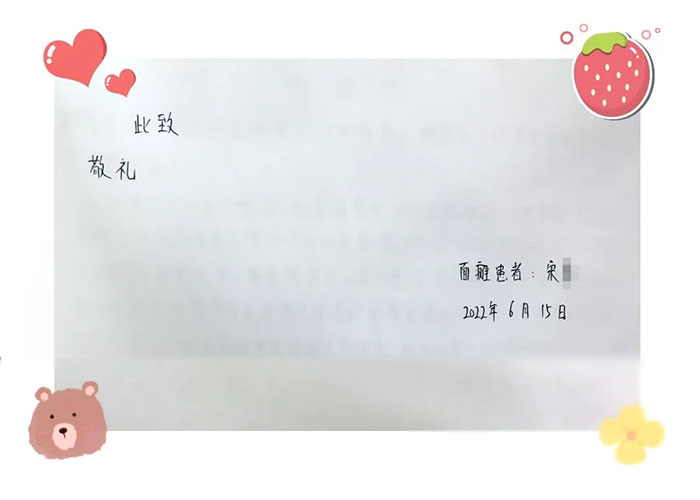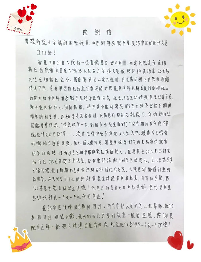 经过多日的精心治疗,宋女士右眼睑闭合不全、口角歪斜等症状有了明显改善。也正是在这段时间,细心的宋女士观察到,蓝十字的医护人员即使再忙,也不会敷衍、怠慢任何一位患者。他们总是想尽办法,以一切努力来满足大家的需求,在这些特殊的日子里,与大家共同相守。这让她由心底深受感动,最终决定以感谢信的形式,把这份情感记录下来。