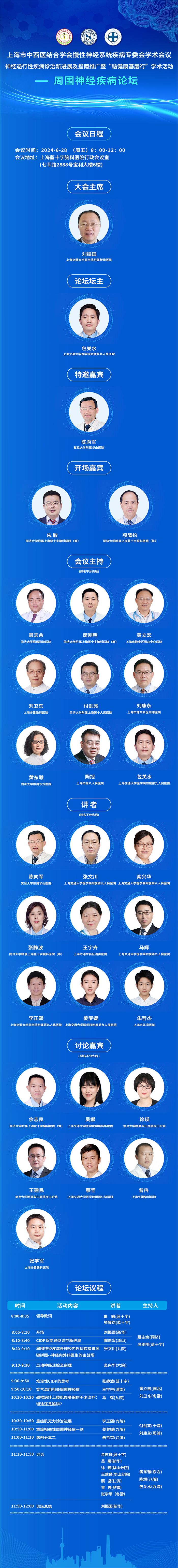 2024年上海市中西医结合学会慢性神经系统疾病专委会学术会议——神经退行性疾病诊治新进展及指南推广暨“脑健康基层行”学术活动——周围神经疾病论坛将于6月28日在上海蓝十字脑科脑科医院【同济大学附属上海蓝十字脑科医院(筹)】召开,嘉宾均为该领域的知名专家。会议诚邀各位同道参与,共享神经病学学术盛宴,共谋学科未来发展!