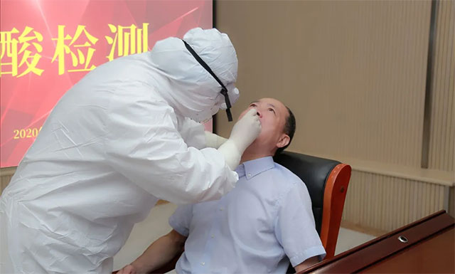 院感科牵头,全院上下各部门紧密配合:对全院在岗职工进行摸底,积极落实试纸试剂,迅速备齐采样人员防护装备等,并抽调检验科主任刘风华及3位护士长——李楠楠、赵得梅、舒畅——组成咽拭子采样小组,之前,她们均经过专门的采样培训。
