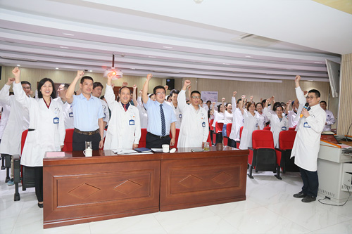 会议最后,在潘耀良副院长的带领下,全体员工庄严宣誓:“创建JCI,有你有我有他;创建JCI,依靠我们大家!以国际标准的理念指导我们的思想,以国际标准的规范指导我们的行为,学习JCI,践行JCI,紧紧围绕‘以患者为中心的核心理念’,全面提升医疗质量,确保患者安全。同心同力,团结一致。坚定信心,坚韧不拔,冲刺100天,拿下JCI。”