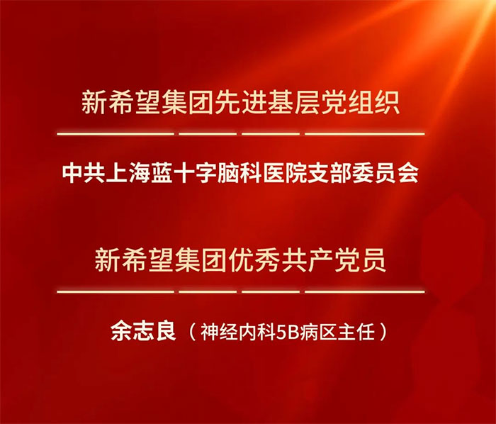 2023年是全面贯彻落实党的二十大精神的开局之年,在庆祝中国共产党成立102周年之际,为表彰先进,树立楷模,新希望集团“两优一先”表彰名单近日正式出炉。中共上海蓝十字脑科医院支部委员会和神经内科5B病区主任余志良分别荣获“新希望集团先进基层党组织”和“新希望集团优秀共产党员”荣誉称号。