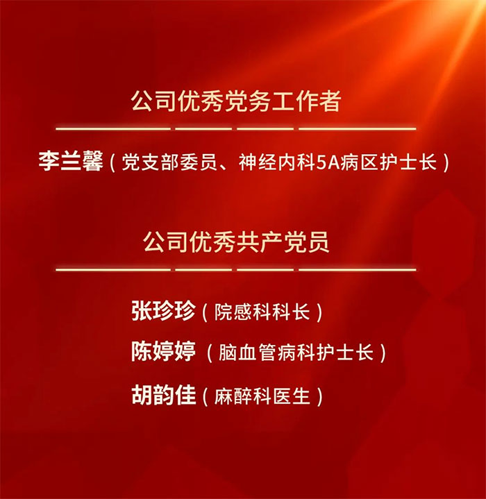 另悉,上海蓝生脑科医院投资股份有限公司近日通报表彰了先进基层党组织、优秀党务工作者和优秀共产党员。医院党支部委员、神经内科5A病区护士长李兰馨被授予“公司优秀党务工作者”;医院院感科科长张珍珍、脑血管病科护士长陈婷婷、麻醉科医生胡韵佳被授予“公司优秀共产党员”荣誉称号。