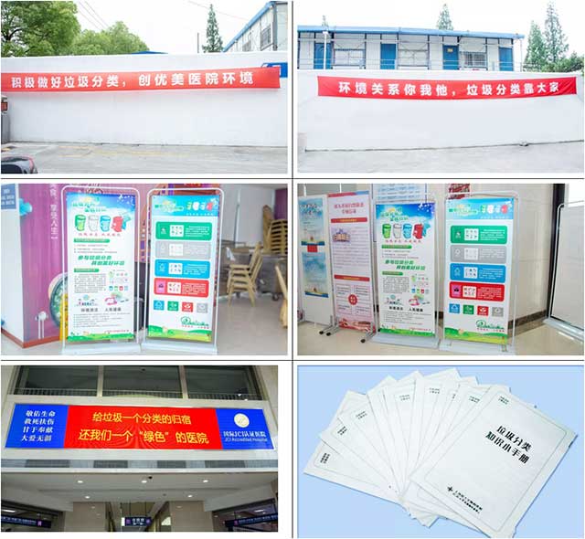 医院充分利用各种媒体和宣传手段,持续开展全方位的垃圾分类宣传——院外醒目位置悬挂“积极做好垃圾分类,创优美医院环境”等宣传横幅;门诊大厅、病区以及员工食堂等,通过电子屏幕、宣传标语和易拉宝都能看到垃圾分类宣传。