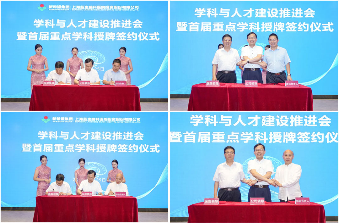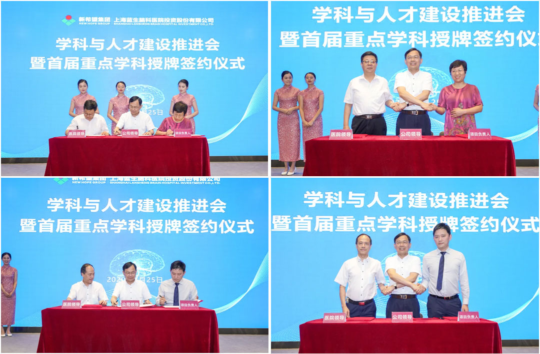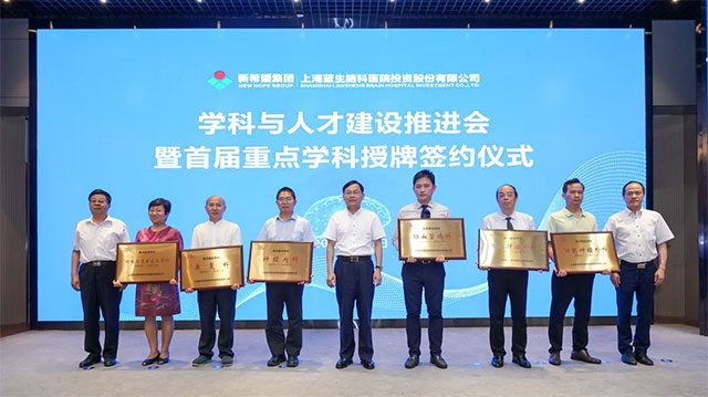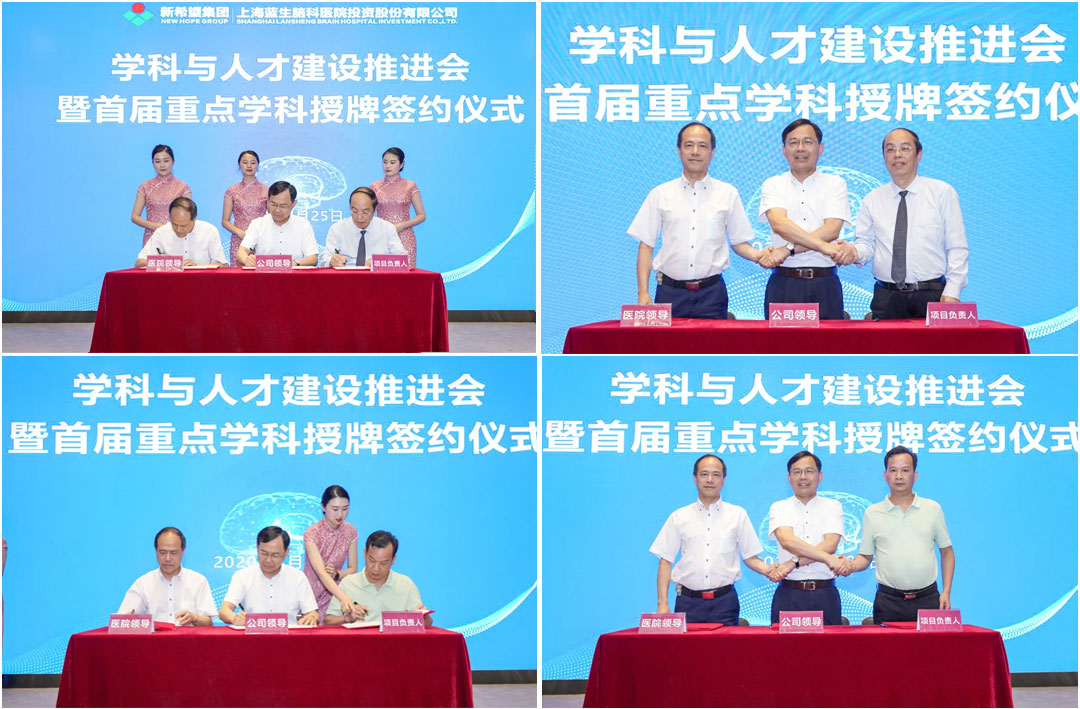 卓立强董事长向获得首届重点学科、优秀学科带头人及后备人才表示祝贺!他和天佑医院院长蔡剑飞、蓝十字脑科医院院长项耀钧分别与重点学科带头人签约,并为重点学科授牌,向34位卓越人才颁发证书。