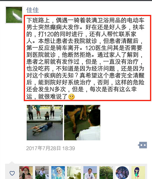 下班路上,偶遇一骑着装满卫浴用品电动车的男士突然癫痫大发作。好在还是好人多,扶车的,打120的同时进行,还有人帮忙联系家人。本想让患者去我院就诊,但患者清醒后,第一反应是骑车离开。120医生问其是否需要到医院就诊,他断然拒绝。通过家人了解到,患者之前就有发作过,但是,一直没有治疗,也没吃药,不知道是因为经济问题,还是因为对这个疾病的无知?真希望这个患者完全清醒后,能到院好好系统治疗,否则,这样的危险还会发生N多次,但是,每次是否有这么幸运,就很难说了[苦笑]