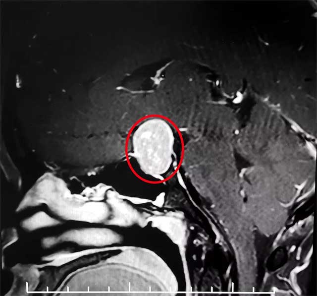 送当地医院就诊,经医院检查提示泌乳素增高,达1092μIU/mL,最后头颅MRI提示垂体腺瘤。