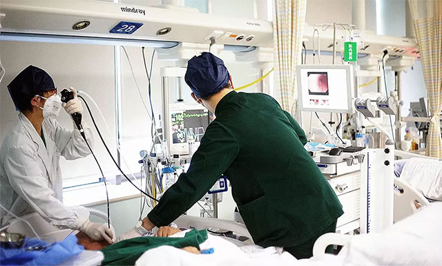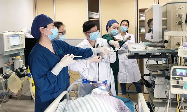 ▲ 神经外科ICU刘苏医生(左一)用电子支气管镜为患者检查灌洗