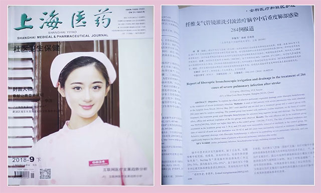 李鲁萍还与科室团队成员查峰、岳尧尧在《上海医药》2018年第九期中联合发表了题为《纤维支气管镜灌洗引流治疗脑卒中后重度肺部感染284例报道》的学术论文,获得了同行好评。