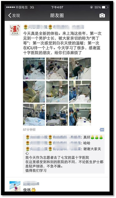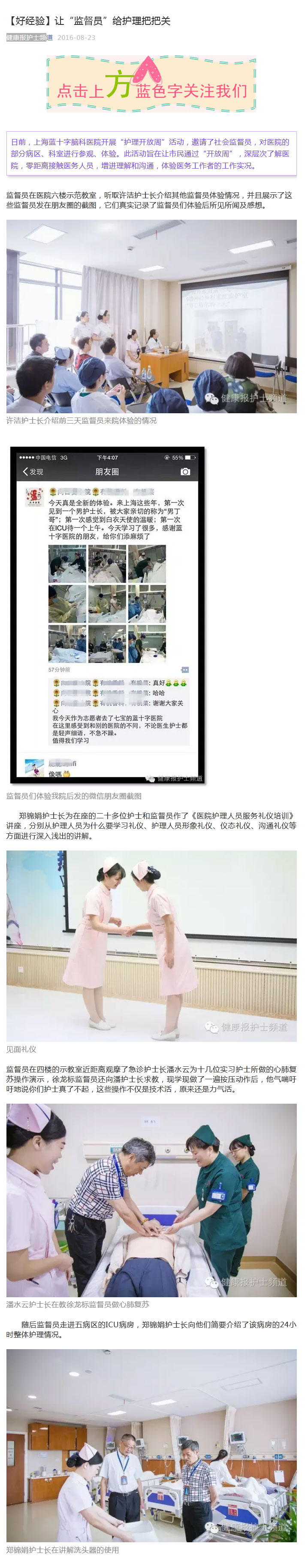 日前,上海蓝十字脑科医院开展“护理开放周”活动,邀请了社会监督员,对医院的部分病区、科室进行参观、体验。此活动旨在让市民通过“开放周”,深层次了解医院,零距离接触医务人员,增进理解和沟通,体验医务工作者的工作实况。