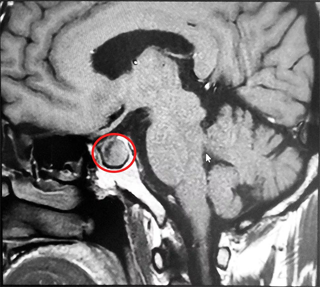 王先生是一名医生,担任一家医院的急诊科主任。一个多月前,王先生发现自己的脖子变得越来越粗,有疼痛感,同时还伴有头疼。经医院检查,甲状腺左叶下极低回声结节(TI-RADS 3级),甲状腺下极不均质低回声;促甲状腺激素:9.31mIU/L,诊断为亚急性甲状腺炎。但经过一段时间治疗,王先生间歇性头痛未见明显好转。再经当地市医院磁共振检查,垂体窝占位,考虑垂体瘤。后转入上海蓝十字脑科医院寻求进一步治疗。