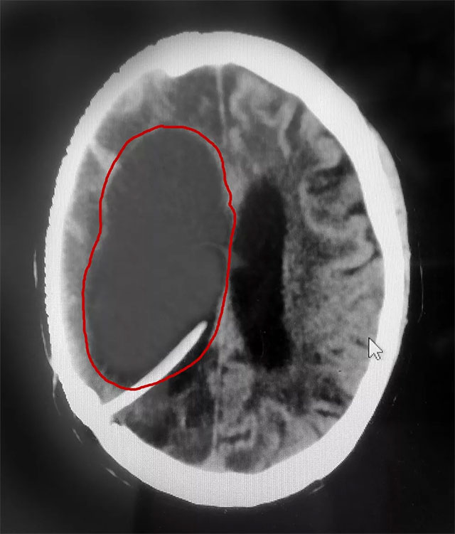 ▲ 患者右侧脑室重度脑积水被及时置管分流