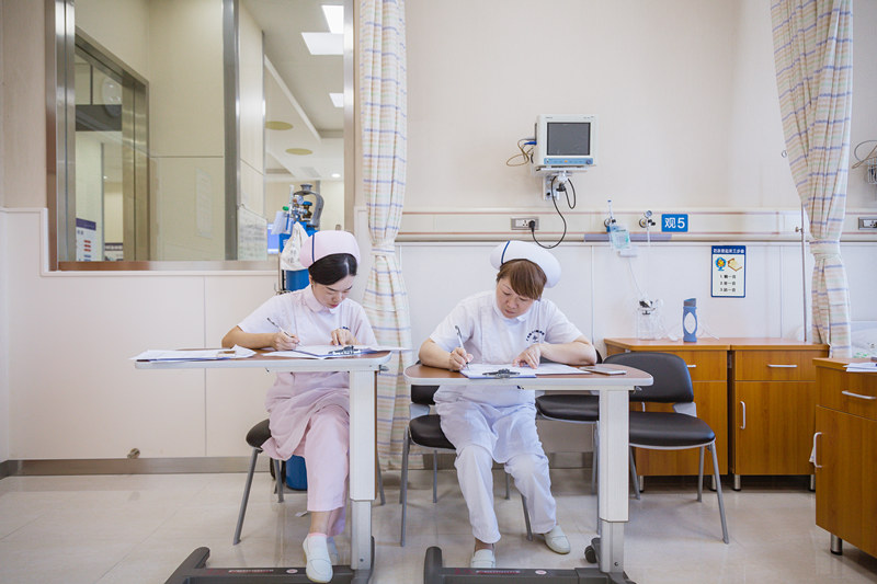 监考护士长郑锦娟和王晓静认真记录每一位护士的考试情况