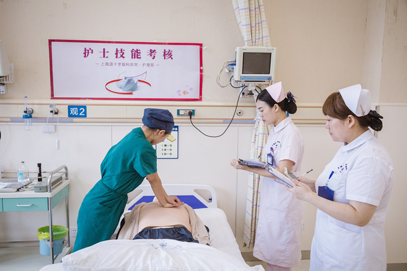 考试中护士们表现积极,态度诚恳,虚心接受监考老师的悉心指导与点评。判断与呼救→安置体位→心脏按压→开放气道→人工呼吸→判断复苏效果→整理记录,整个心肺复苏操作做得有条不紊,部分护士展现出了较高水平。