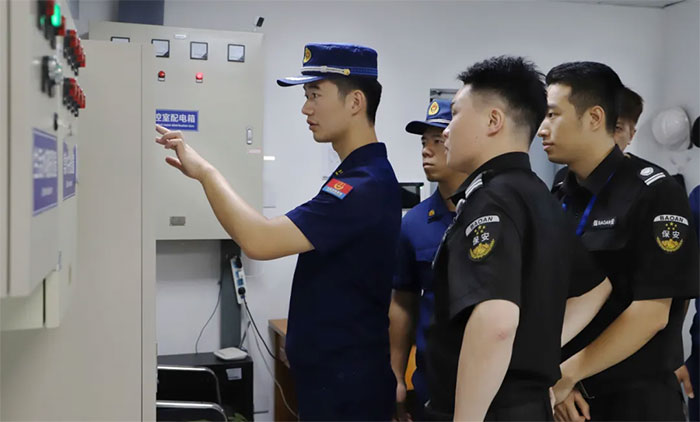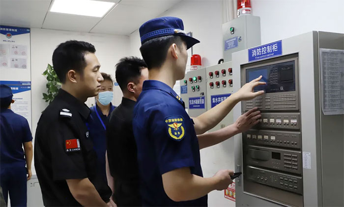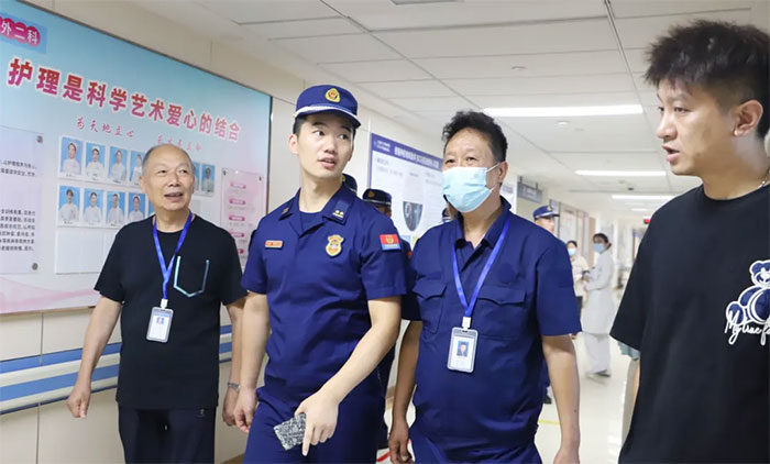 医院作为人群密集且设备繁多的特殊场所,消防安全及生产安全关乎众多生命健康,不容忽视。因此,医院的安全管理必须常态化。为进一步加强消防安全管理工作,推动医院安保组织更加健全、安全管理制度更加规范、风险预警机制更加高效、应急处置机制更加完善,确保医院安全平稳运行,8月28日上午,上海市闵行区消防救援局七宝救援站指导员张翔率队莅临上海蓝十字脑科医院【同济大学附属上海蓝十字脑科医院(筹)】进行消防安全调研指导。总务科科长陈正松、副科长汪嘉伟、消防微型消防站站长陈伟智陪同。
