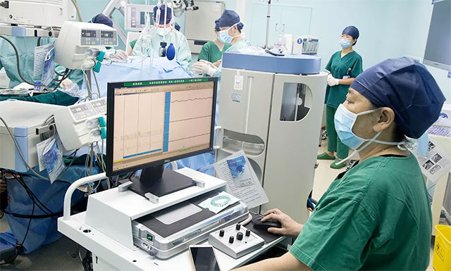 术中,面肌肌电图检测到患者眼轮匝肌有自发性电活动。在显微镜下可见,患者的小脑前下动脉和小脑后下动脉与面神经接触密切。沈建康教授小心翼翼地将面神经与责任血管分离,并填入特殊材质的垫片。在神经电生理监测的“保驾护航”下,避免过重牵拉损伤患者的面神经。随着垫片成功填入,患者面肌肌电图的自发性电活动消失了。