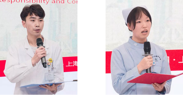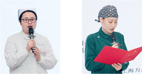 天佑医院实习生李兴长、上海蓝十字脑科医院实习生卜雪琴作为学生代表畅谈了各自在实习中的所见所闻所感,从开始实习时的迷茫、自我怀疑到逐渐融入,从实习的观摩学习者到护理工作的参与者,情真意切地表达了对老师们的感谢,感谢老师在生活中、学习中给予的关怀与帮助,把他们领进多彩的护理道路。
