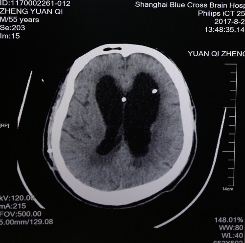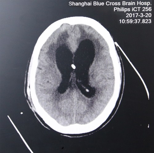 入院初头颅CT影像:之前做过分流手术,置入两分流管,脑室扩大、肿胀、有软化、渗出,脑压高