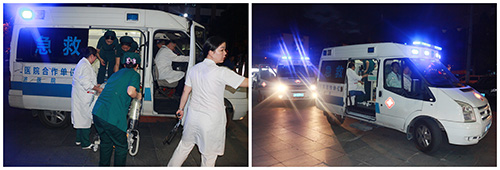 ▲趁着朦胧夜色,两辆救护车载着医务人员出发前往比赛现场