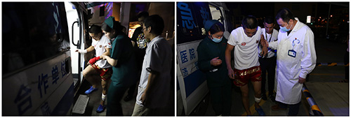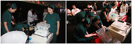 14场争锋对决,只要有选手受伤,医务人员能现场处理的,第一时间紧急处理,现场不能完全处理的,以最快的速度用救护车通过急诊绿色通道送到医院处理,再次有力、有效地保障了本次散打赛事的顺利进行,以出色的表现和优良的医技能力,赢得了“运动员健康守护神”的赞誉。
