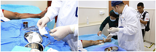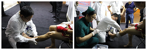 第一场60kg级对决,红方选手虽然取得了比赛的胜利,却也在比赛中不慎导致左下肢软组织裂伤,伤口裂开约3公分,鲜血直流。蓝十字医务人员现场紧急为他进行了清创、止血、包扎处理。由于条件限制、不便现场缝合,随即安排候在场外的救护车与一名急诊护士陪护,以最快时间将其送往医院,通过急诊绿色通道进一步为其进行清创缝合和破伤风疫苗注射,以防止继发感染的可能性。
