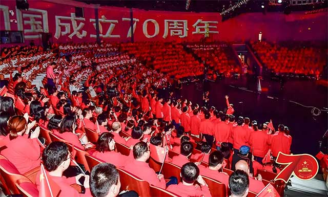 接着,全场在《爱我中华》嘹亮的歌声中,主题歌会正式拉开帷幕。歌会分为峥嵘岁月稠——再把春来报——礼赞新中国——奋进新时代4个篇章,共12首合唱曲目。《十送红军》《沁园春.雪》《红旗飘飘》《不忘初心》《生命之爱》......当这些熟悉的旋律和歌声响起,在场几乎所有人都激动而兴奋起来,挥舞着手中的五星红旗,仿佛又回到了激情燃烧的岁月。