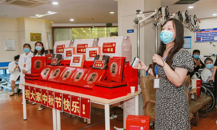 有位坐轮椅的患者前来观赛,被活动欢快的气氛所感染,因一侧手臂活动不便,双手不能鼓掌,就用另一手“击股为号”(用手掌拍大腿发出响声)。朱敏书记获悉后,也为这位“最佳观众”送上了一盒月饼。