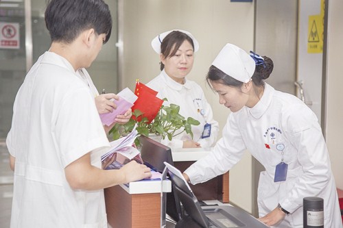 与医学影像科在同一楼层的DSA护士长王晓静(下图中),平时工作非常繁忙,在长假前已经加了好几个夜班,但她仍然精神抖擞地在节假日坚守在工作岗位上,带领团员志愿者们认真完成接待和检查工作。