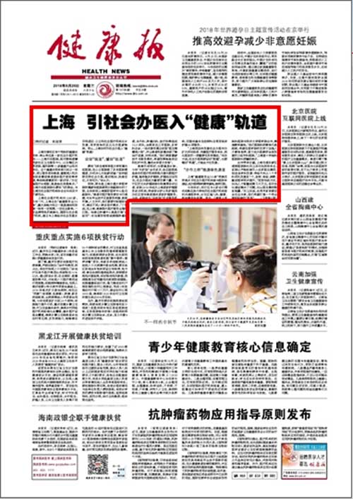 9月26日,作为国家卫生健康委员会主管的最具影响的全国性卫生行业报的《健康报》,在头版头条刊发了题为《上海 引社会办医入“健康”轨道》的文章,对最新出台的上海“健康服务业50条”中的政策亮点予以重点关注和报道。