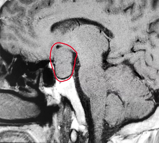 针对患者情况,6B病区主任潘仁龙基于多年临床经验立即作出判断,急行头颅鞍区MRI平扫+增强,显示:蝶鞍扩大,鞍底骨质下陷;鞍内垂体上缘膨隆,腺垂体中央见一枚类椭圆形异常信号,大小约2.8*1.9cm;T1WI上呈等信号、T2WI呈等信号为主局部见斑片状低信号,轮廓光整,增强后可见大部分明显强化,视交叉可见上抬。考虑为垂体腺瘤伴局部卒中。