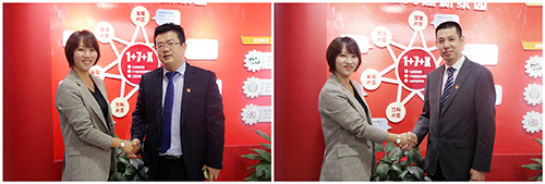 ▲七宝镇社建委副书记吴哲与医院领导握手合影