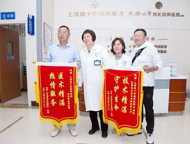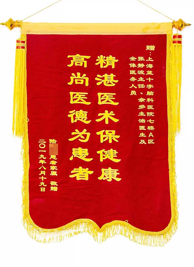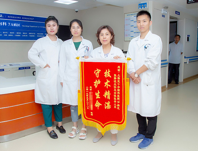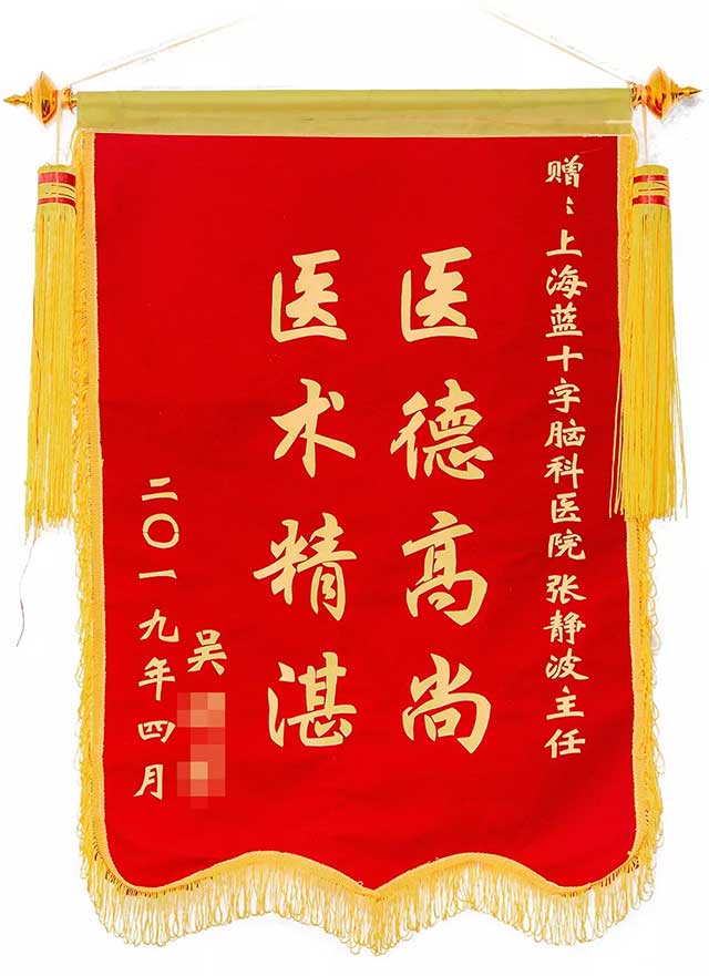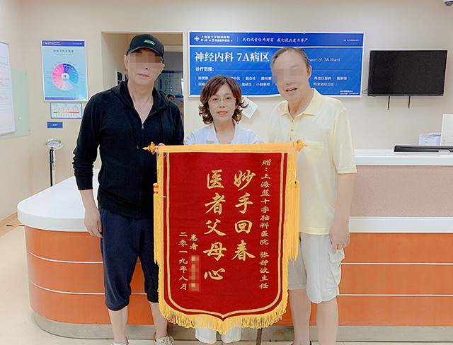 最后,今年3月其父慕名将他儿子转诊至上海蓝十字脑科医院,由王玉霞主任确诊为“营养不良周围神经病变”,经过张静波主任和7A病区医护人员悉心照料,经过一个多月,该男生开始喝粥了,体力也逐渐恢复,再过两个月,该男生能下地走动了,自入院100天不到就顺利出院了。他父亲非常感激,连连送红包给王玉霞和张静波主任,被婉拒,出院那天送了两面锦旗给这两位主任,并一再邀请张静波来宁波“旅游”亦被张静波主任婉拒了。