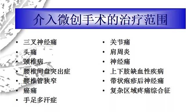 焦国华介绍,介入微创技术是近年发展起来的一项新技术,与传统手术相比,具有创伤小、出血少、操作安全、经济方便、减少住院时间等优势。目前,疼痛科介入微创手术的治疗范围已相当广泛,包括: