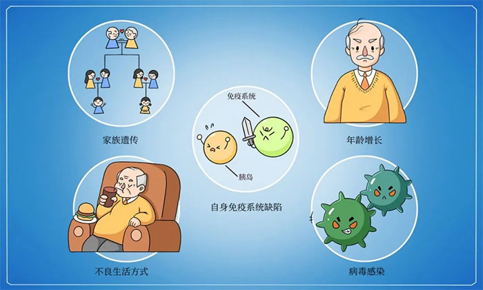糖尿病是由于胰岛素分泌不足及(或)作用缺陷引起的以血糖升高为特征的代谢病。主要诱因为遗传因素、病毒感染、肥胖、精神因素等导致的自身免疫功能障碍。