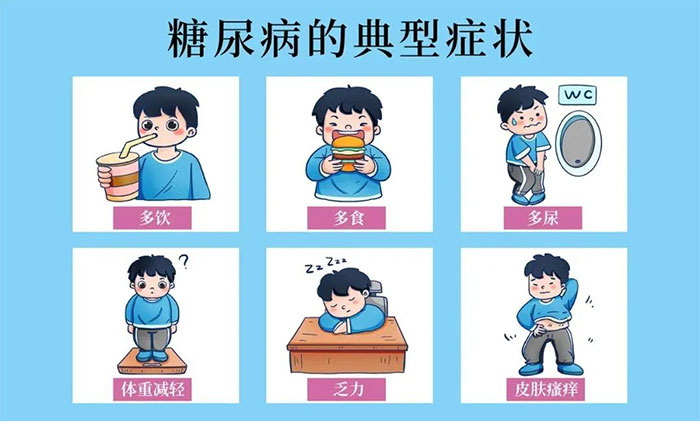 糖尿病的典型症状是“三多一少”(多饮、多食、多尿、体重减轻)。