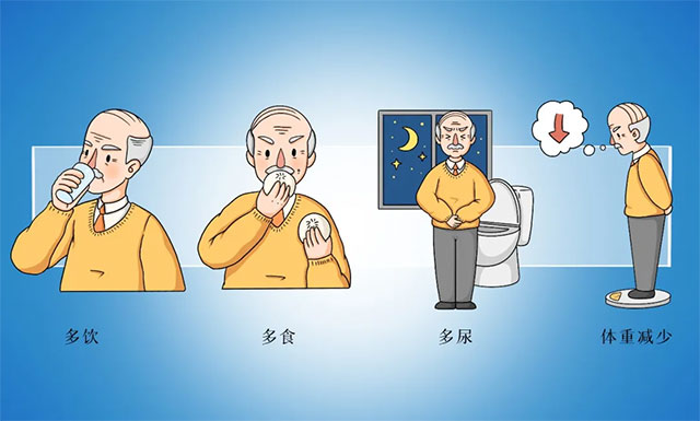 一、典型症状:“三多一少”——多饮、多食、多尿,体重减少。