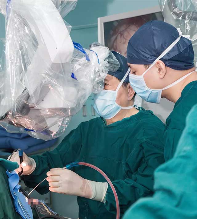 ▲ 借助蔡司显微镜(双荧光),沈建康教授为患者手术